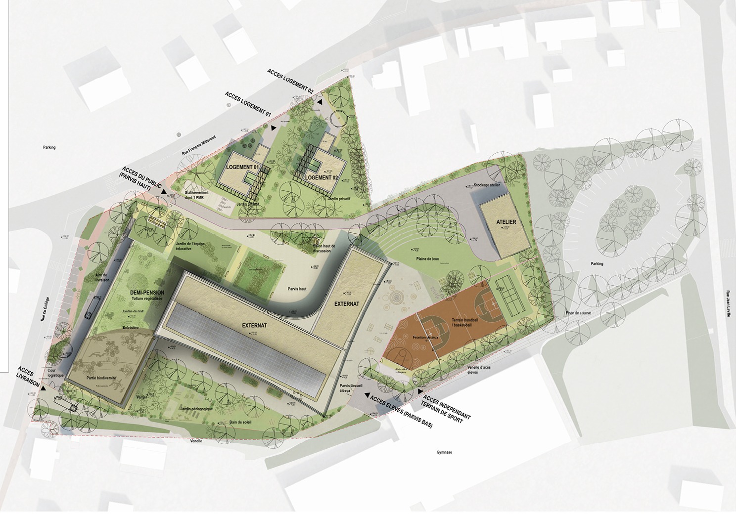 Le projet s’inscrit pleinement dans son environnement en valorisant les qualités naturelles du lieu. Il propose des espaces vivants qui dialoguent avec le relief, les vues et les usages existants. L’objectif est de créer un collège ouvert sur son territoire, où chaque aménagement renforce le lien entre les élèves, l’équipe éducative et leur cadre de vie.