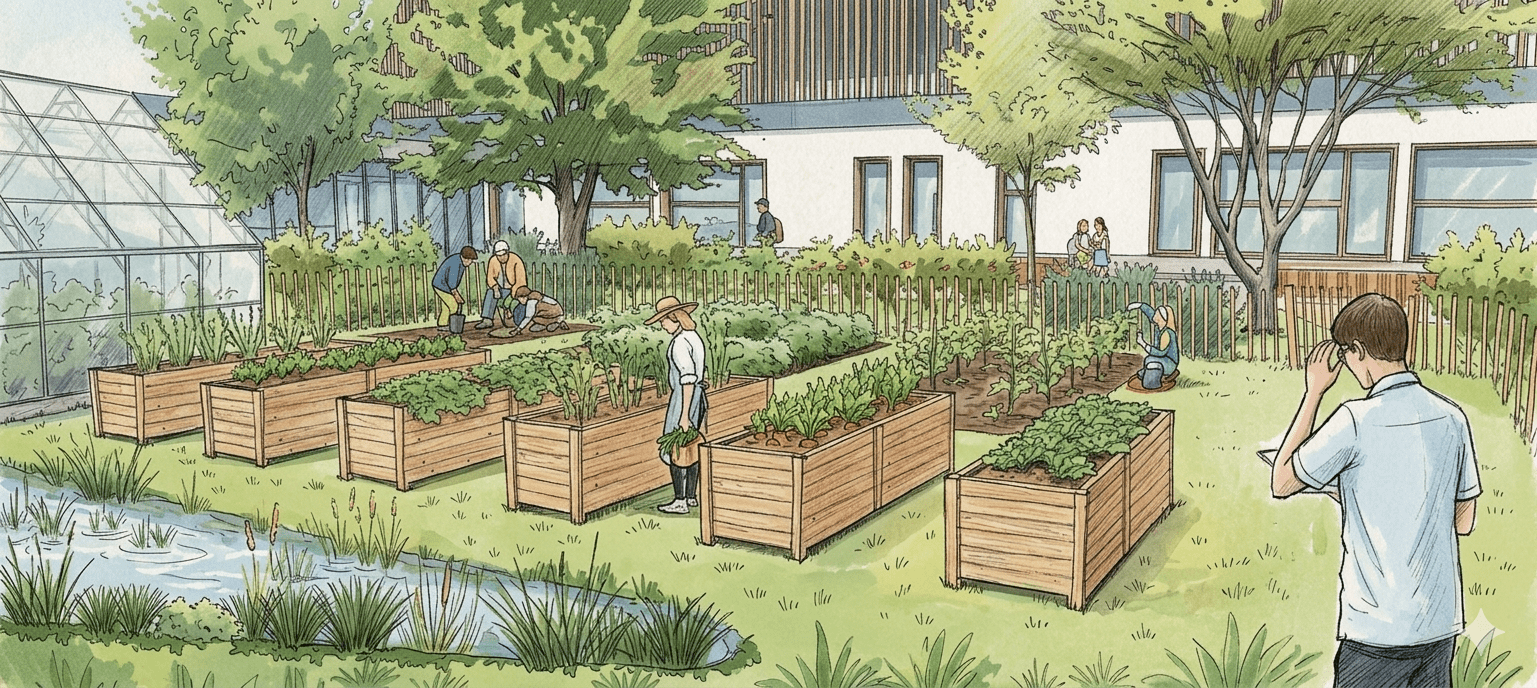 Le projet intègre un jardin nourricier composé d’un potager, d’un verger et d’une serre réalisée en réemploi. Cet espace pédagogique permet de sensibiliser les élèves aux cycles du vivant, à l’alimentation durable et aux pratiques écologiques. Il devient un support concret pour des activités éducatives variées.