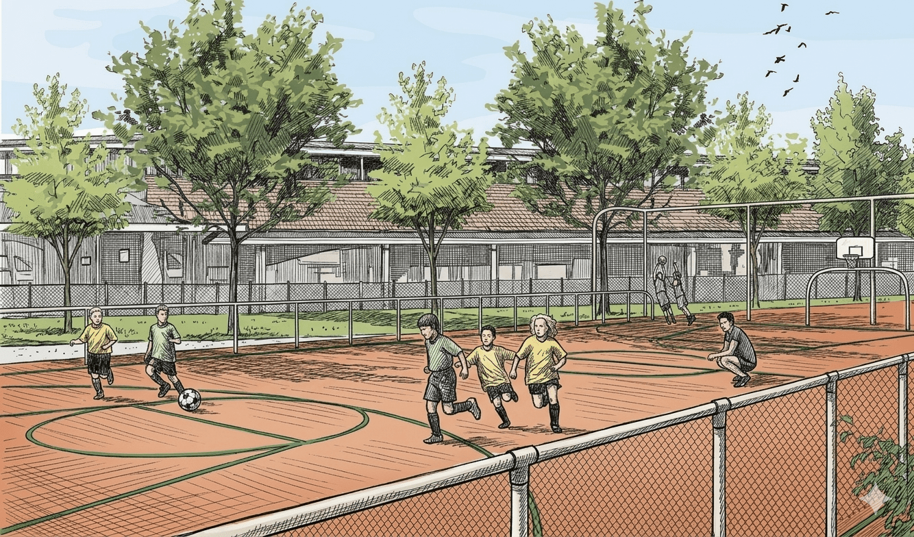 Une aire de jeux dynamique est développée selon les principes du design actif. Elle comprend notamment des terrains multisports accessibles librement, encourageant la pratique physique quotidienne. Ces espaces favorisent le bien-être des élèves, tout en offrant des lieux de convivialité et de partage.